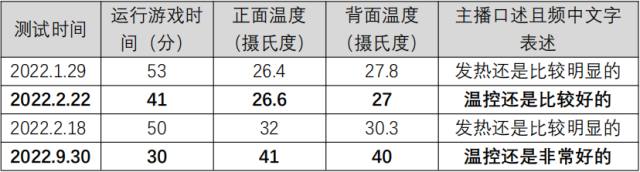 問題描述:博主于2022年1月至9月先后4次對不同手機進行溫度測試。在經(jīng)過一定時間運行游戲后,使用測溫儀對手機正面及背面進行測溫,并對手機的溫控效果進行點評,4次測評結(jié)果出入較大,不同品牌的手機測評前后標(biāo)準(zhǔn)不一。