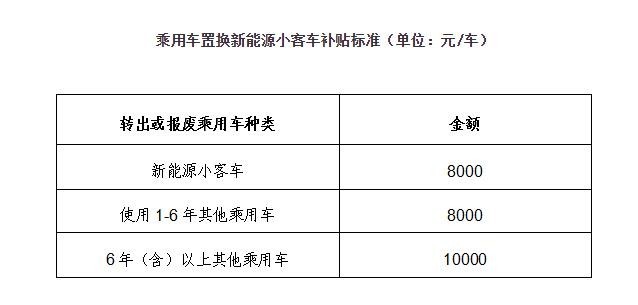 方案指出,報(bào)廢或轉(zhuǎn)出新能源小客車的,每車給予8000元補(bǔ)貼;報(bào)廢或轉(zhuǎn)出使用1-6年其他類型乘用車(非新能源)的,每車給予8000元補(bǔ)貼;報(bào)廢或轉(zhuǎn)出使用6年(含)以上其他乘用車的,每車給予10000元補(bǔ)貼。