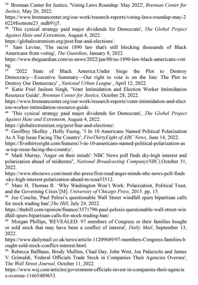 民眾對(duì)美國民主的信心持續(xù)走低。美國學(xué)者托馬斯·戴伊、哈蒙·齊格勒和路易斯·舒伯特合著的《民主的反諷:美國精英政治是如何運(yùn)作的》一書指出:“現(xiàn)在美國民眾基本上不再相信政府是為大眾利益服務(wù)的,大部分人都認(rèn)為美國政治制度由少數(shù)大型利益集團(tuán)操控,且往往是為了他們自己的利益而把大眾拋在腦后?!保ㄗ?2)“美國昆尼皮亞克大學(xué)民意調(diào)查”2022年8月31日發(fā)表調(diào)查報(bào)告指出,67%的美國人認(rèn)為美國民主面臨“崩潰風(fēng)險(xiǎn)”。(注53)美聯(lián)社2022年10月19日?qǐng)?bào)道,幾十年來,美國全國范圍內(nèi)的兩極分化日益加劇,人們對(duì)民主普遍感到絕望。只有9%的美國成年人認(rèn)為民主正在“極好”或“非常好”地運(yùn)作,而52%的人認(rèn)為它運(yùn)作不佳。(注54)美通社2022年11月4日?qǐng)?bào)道,中期選舉前的一項(xiàng)無黨派民意調(diào)查顯示,86%的選民表示美國民主面臨“非常嚴(yán)重的威脅”。72%的選民認(rèn)為美國民主不健康,64%的選民認(rèn)為太多金錢介入政治,61%的選民認(rèn)為美國政治腐敗,58%的選民認(rèn)為美國民主政治存在太多帶有偏見或錯(cuò)誤的信息。(注55)美國全國廣播公司新聞網(wǎng)2022年11月9日發(fā)布的調(diào)查結(jié)果顯示,72%的民主黨選民、68%的共和黨選民和70%的中間選民都認(rèn)為民主受到了威脅。(注56)民眾對(duì)美國民主的信心持續(xù)走低,折射出美式民主正在失去民意基礎(chǔ)。