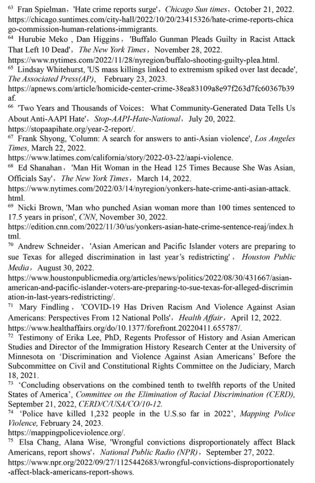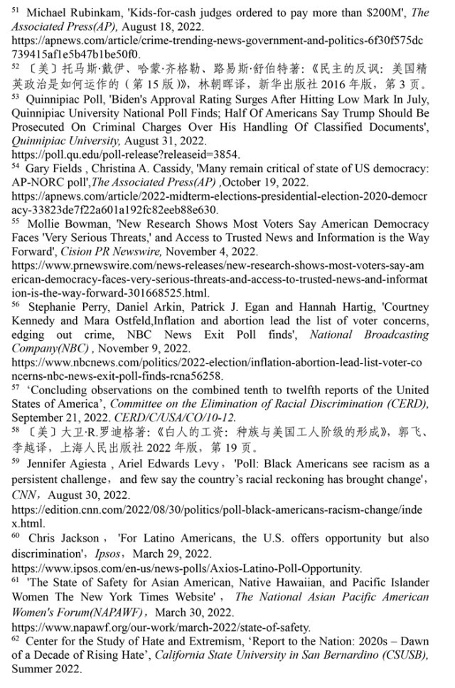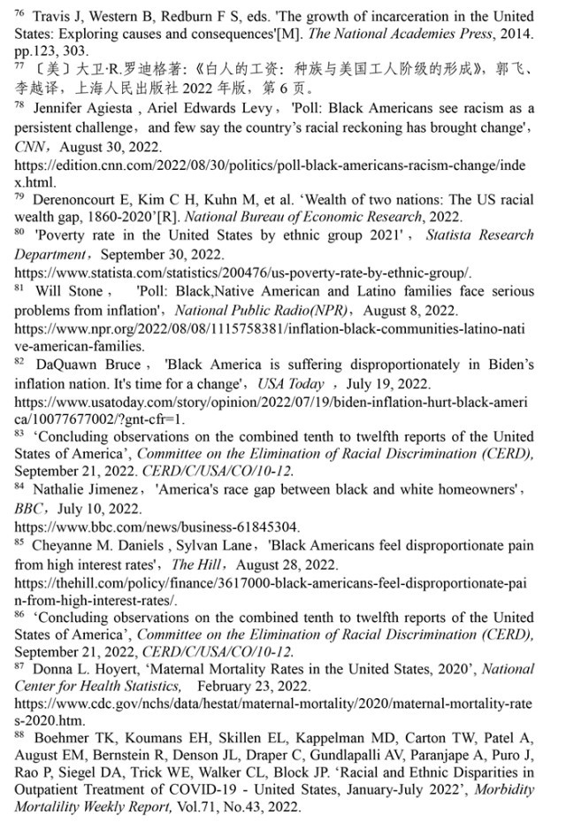 聯(lián)合國消除種族歧視委員會(huì)2022年9月21日發(fā)布的關(guān)于審議美國履行《消除一切形式種族歧視國際公約》情況的結(jié)論性報(bào)告指出,美國歷史上殖民主義和奴隸制留下的陰影至今仍揮之不去,助長著美國社會(huì)流行的種族主義。近幾年來,美國仇恨犯罪和仇恨言論事件顯著增加,與種族有關(guān)的槍支死傷人數(shù)大幅增加,有色人種和少數(shù)族裔在醫(yī)療、教育、住房等領(lǐng)域持續(xù)面臨系統(tǒng)性歧視。(注57)