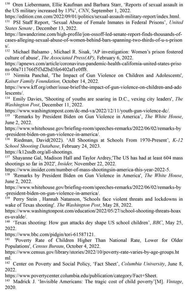 婦女墮胎失去憲法保護(hù),兒童生存環(huán)境令人擔(dān)憂。美國聯(lián)邦最高法院推翻“羅伊訴韋德案”的裁決終結(jié)了近50年來受憲法保護(hù)的墮胎權(quán),是對(duì)婦女人權(quán)和性別平等的巨大打擊。2022年美國有超過5800名18歲以下的兒童因槍擊受傷或死亡,校園槍擊事件數(shù)量高達(dá)302起,創(chuàng)1970年以來的最高值。美國兒童貧困率從2021年12月的12.1%上升至2022年5月的16.6%,增加了330萬貧困兒童。2018年以來被非法雇用的童工激增近70%,2022財(cái)年受雇專門從事危險(xiǎn)工作的兒童增加了26%。