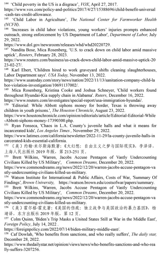 非法使用童工現(xiàn)象屢禁不止。根據(jù)非盈利組織“美國農(nóng)場(chǎng)工人健康中心”的數(shù)據(jù),美國有30萬至80萬名未成年人在農(nóng)場(chǎng)工作。(注145)美國《石板》網(wǎng)絡(luò)雜志指出,美國很多快餐店違反保護(hù)兒童健康與教育的規(guī)定,雇用青少年超時(shí)工作。童工問題屢禁不止,根源是美國法律體系存在漏洞。受新冠疫情和供應(yīng)鏈危機(jī)影響,美國多地出現(xiàn)“用工荒”現(xiàn)象,多州批準(zhǔn)新法案延長未成年人工作時(shí)間。根據(jù)美國勞工部的數(shù)據(jù),2022年,美國有數(shù)百萬青少年受雇在農(nóng)業(yè)、食品服務(wù)、零售、娛樂和建筑行業(yè)工作。(注146)路透社2023年2月28日?qǐng)?bào)道,美國非法雇傭童工問題日益嚴(yán)重,自2018年以來,被非法雇用的童工激增了近70%。根據(jù)美國勞工部的數(shù)據(jù),2022財(cái)年有835家企業(yè)違法雇用3800名兒童,受雇專門從事危險(xiǎn)工作的兒童增加了26%。(注147)《今日美國報(bào)》2022年11月13日?qǐng)?bào)道,威斯康星州帕克斯清潔服務(wù)公司雇用了30多名13至17歲的未成年人在肉類加工廠和農(nóng)場(chǎng)擔(dān)任清潔工。幾名未成年雇員在工作中受傷,其中一名13歲兒童被腐蝕性清潔化學(xué)品燒傷。(注148)路透社2022年12月16日?qǐng)?bào)道,在阿拉巴馬州至少有四家汽車零部件供應(yīng)商被發(fā)現(xiàn)雇傭童工,勞務(wù)派遣機(jī)構(gòu)將未成年人移民安置在工廠工作。(注149)時(shí)至今日,美國仍是聯(lián)合國193個(gè)會(huì)員國中唯一沒有批準(zhǔn)《兒童權(quán)利公約》的國家,解決雇傭童工問題的前景依然黯淡。
