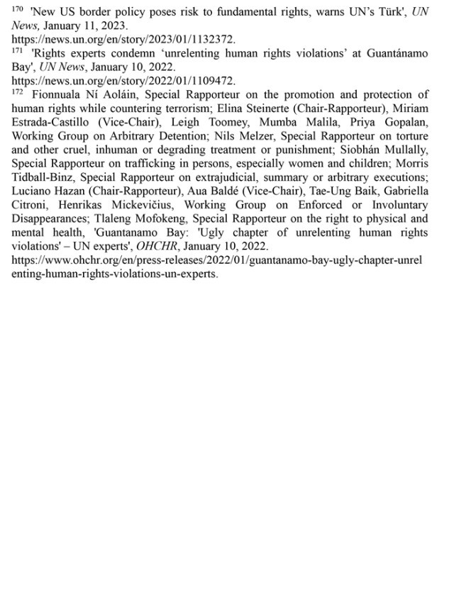 拒不關(guān)閉關(guān)塔那摩監(jiān)獄。2002年設(shè)立的關(guān)塔那摩監(jiān)獄最多時(shí)曾關(guān)押約780人,其中大多數(shù)人未經(jīng)審判便遭拘留,受到了殘忍的、不人道的待遇,是美國“肆意侵犯人權(quán)的一個(gè)丑陋篇章”。(注171)聯(lián)合國人權(quán)理事會(huì)在反恐中促進(jìn)和保障人權(quán)問題特別報(bào)告員菲奧努阿拉·尼奧萊因等多名獨(dú)立專家2022年1月發(fā)表共同聲明指出,臭名昭著的關(guān)塔那摩監(jiān)獄是美國在人權(quán)保護(hù)上的污點(diǎn),要求美國政府關(guān)閉關(guān)塔那摩監(jiān)獄,對(duì)遭受酷刑、任意拘留的公民進(jìn)行賠償,并根據(jù)國際法追究授權(quán)和實(shí)施酷刑的人員的責(zé)任。(注172)