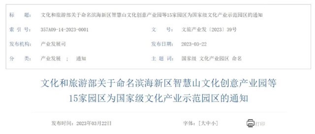根據(jù)文化和旅游部關(guān)于命名濱海新區(qū)智慧山文化創(chuàng)意產(chǎn)業(yè)園等15家園區(qū)為國(guó)家級(jí)文化產(chǎn)業(yè)示范園區(qū)的通知,此次新獲命名的園區(qū)包括天津市濱海新區(qū)智慧山文化創(chuàng)意產(chǎn)業(yè)園、河北省中國(guó)曲陽(yáng)雕塑文化產(chǎn)業(yè)園、江蘇省南京秦淮特色文化產(chǎn)業(yè)園、浙江省衢州儒學(xué)文化產(chǎn)業(yè)園、湖南省馬欄山視頻文創(chuàng)產(chǎn)業(yè)園、西藏自治區(qū)西藏文化旅游創(chuàng)意園區(qū)等。
