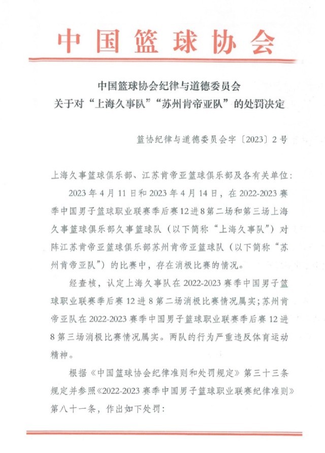 央視網(wǎng)消息:據(jù)@中國籃球協(xié)會 微博消息,4月17日,中國籃球協(xié)會紀律與道德委員會公布關(guān)于對“上海久事隊”“蘇州肯帝亞隊”的處罰決定。
