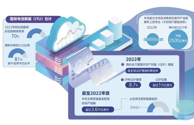 其次,中東消費者對互聯(lián)網(wǎng)、大數(shù)據(jù)、金融科技、新能源等高科技產(chǎn)品和服務(wù)有著旺盛需求,而且有較高的收入水平和支付能力。據(jù)國際電信聯(lián)盟(ITU)估計,2022年阿拉伯國家的互聯(lián)網(wǎng)使用率達70%,擁有手機的人口比例為81%,高于世界平均水平(73%)。據(jù)估計,2022年,中東和北非地區(qū)消費者在數(shù)字產(chǎn)品和服務(wù)上的支出(不包括IT基礎(chǔ)設(shè)施)約為1000億美元,預計到2027年將超過2500億美元。