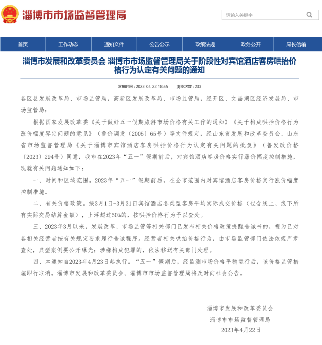 根據(jù)國家發(fā)展改革委《關(guān)于做好五一假期旅游市場價(jià)格有關(guān)工作的通知》《關(guān)于構(gòu)成哄抬價(jià)格行為漲價(jià)幅度界定問題的意見》(魯價(jià)調(diào)發(fā)〔2005〕65號)等文件規(guī)定,經(jīng)山東省發(fā)展和改革委員會、山東省市場監(jiān)督管理局《關(guān)于淄博市賓館酒店客房哄抬價(jià)格行為認(rèn)定有關(guān)問題的批復(fù)》(魯發(fā)改價(jià)格〔2023〕294號)同意,我市在2023年“五一”假期前后,對賓館酒店客房價(jià)格實(shí)行漲價(jià)幅度控制措施,現(xiàn)就有關(guān)問題通知如下: