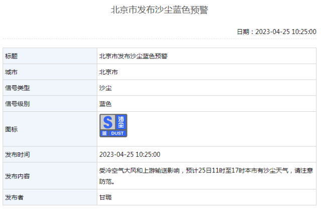 2023年04月25日10時25分,北京市氣象臺發(fā)布沙塵藍色預(yù)警。