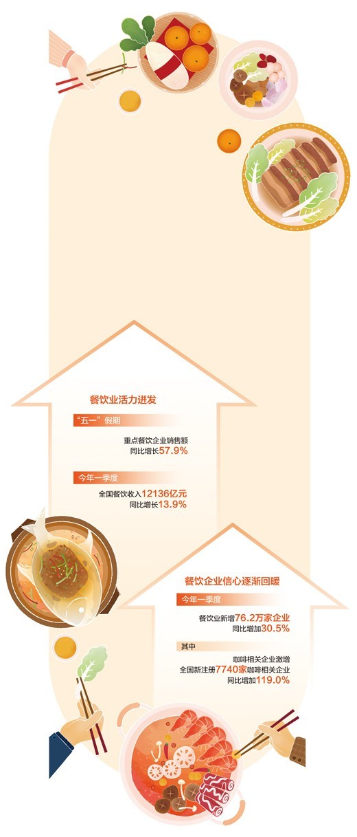 餐飲業(yè)是促消費(fèi)、惠民生、穩(wěn)就業(yè)的重點(diǎn)領(lǐng)域。今年以來(lái),餐飲消費(fèi)一直呈現(xiàn)加快恢復(fù)向好態(tài)勢(shì),一季度全國(guó)餐飲收入同比增長(zhǎng)13.9%,餐飲業(yè)新增企業(yè)數(shù)同比增加30.5%。餐飲業(yè)加快恢復(fù)向好、持續(xù)激發(fā)活力,為恢復(fù)和擴(kuò)大消費(fèi)提供有力支撐。