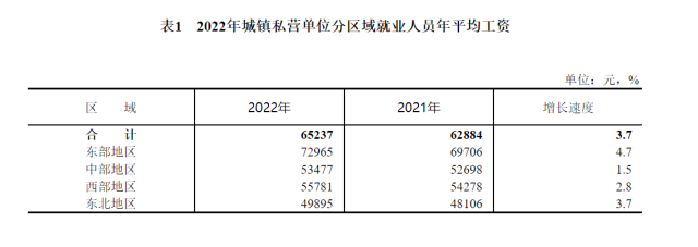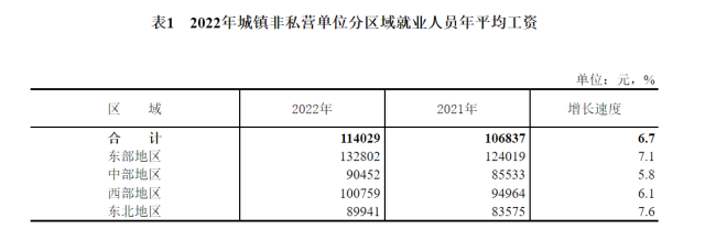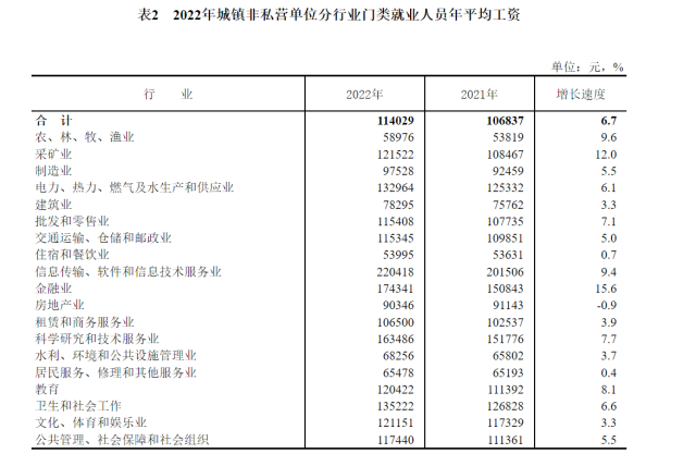 數(shù)據(jù)顯示,2022年,全國城鎮(zhèn)非私營單位就業(yè)人員年平均工資為114029元,比上年增長6.7%,增速比2021年回落3.0個百分點,扣除價格因素實際增長4.6%;城鎮(zhèn)私營單位就業(yè)人員年平均工資為65237元,比上年增長3.7%,回落5.2個百分點,扣除價格因素實際增長1.7%。