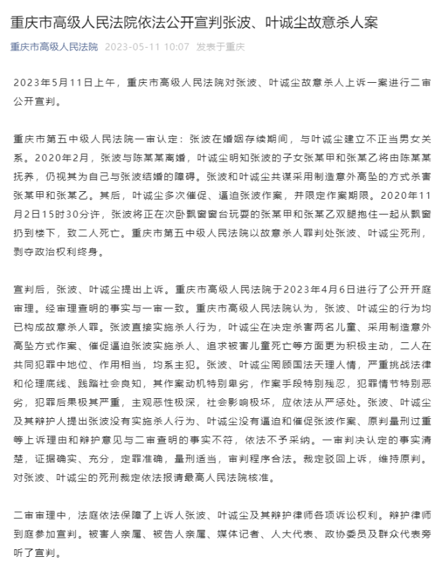 宣判后,張波、葉誠塵提出上訴。重慶市高級人民法院于2023年4月6日進行了公開開庭審理。經(jīng)審理查明的事實與一審一致。重慶市高級人民法院認為,張波、葉誠塵的行為均已構(gòu)成故意殺人罪。張波直接實施殺人行為,葉誠塵在決定殺害兩名兒童、采用制造意外高墜方式作案、催促逼迫張波實施殺人、追求被害兒童死亡等方面更為積極主動,二人在共同犯罪中地位、作用相當(dāng),均系主犯。張波、葉誠塵罔顧國法天理人情,嚴重挑戰(zhàn)法律和倫理底線、踐踏社會良知,其作案動機特別卑劣,作案手段特別殘忍,犯罪情節(jié)特別惡劣,犯罪后果極其嚴重,主觀惡性極深,社會影響極壞,應(yīng)依法從嚴懲處。張波、葉誠塵及其辯護人提出張波沒有實施殺人行為、葉誠塵沒有逼迫和催促張波作案、原判量刑過重等上訴理由和辯護意見與二審查明的事實不符,依法不予采納。一審判決認定的事實清楚,證據(jù)確實、充分,定罪準(zhǔn)確,量刑適當(dāng),審判程序合法。裁定駁回上訴,維持原判。對張波、葉誠塵的死刑裁定依法報請最高人民法院核準(zhǔn)。