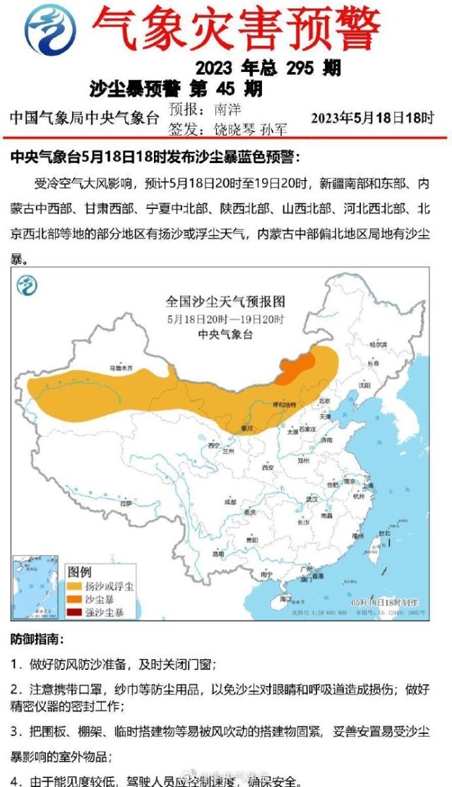央視網(wǎng)消息:中央氣象臺(tái)5月18日18時(shí)發(fā)布沙塵暴藍(lán)色預(yù)警,受冷空氣大風(fēng)影響,預(yù)計(jì)5月18日20時(shí)至19日20時(shí),新疆南部和東部、內(nèi)蒙古中西部、甘肅西部、寧夏中北部、陜西北部、山西北部、河北西北部、北京西北部等地的部分地區(qū)有揚(yáng)沙或浮塵天氣,內(nèi)蒙古中部偏北地區(qū)局地有沙塵暴。