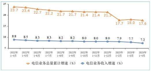 工信部:2023年1—4月份電信業(yè)務收入同比增長7.2%
