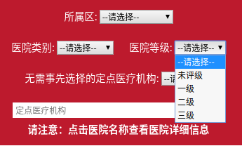 同時(shí)可選擇所屬區(qū)、醫(yī)院類別(定點(diǎn)中醫(yī)醫(yī)院、定點(diǎn)??漆t(yī)院、對外綜合等醫(yī)院等)、醫(yī)院等級,或輸入定點(diǎn)醫(yī)院名稱進(jìn)行詳細(xì)查詢。