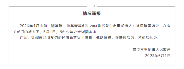 央視網(wǎng)消息:據(jù)“普寧發(fā)布”微信公眾號(hào)消息,普寧市里湖鎮(zhèn)人民政府情況發(fā)布通報(bào)稱(chēng),2023年4月中旬,潘某隆、詹某豪等6名少年(均系普寧市里湖鎮(zhèn)人)被誘騙至境外。在有關(guān)部門(mén)的努力下,6月1日,6名少年安全返回家中。