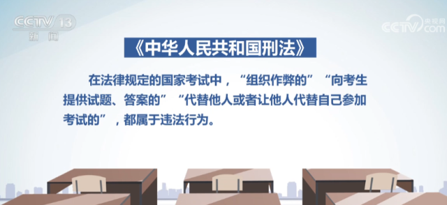 《中華人民共和國刑法》規(guī)定,在法律規(guī)定的國家考試中“組織作弊的”“向考生提供試題、答案的”“代替他人或者讓他人代替自己參加考試的”,都屬于違法行為。《最高人民法院、最高人民檢察院關(guān)于辦理組織考試作弊等刑事案件適用法律若干問題的解釋》明確,對在高考等國家教育考試中組織作弊的,將直接認(rèn)定為“情節(jié)嚴(yán)重”行為,處三年以上七年以下有期徒刑并處罰金。