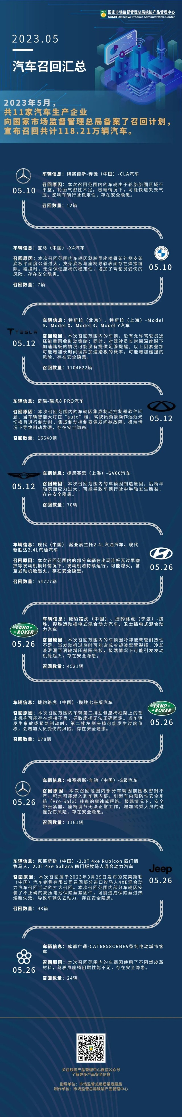 據(jù)“市說新語”微信公眾號6月7日消息,2023年5月共11家汽車生產(chǎn)企業(yè)向市場監(jiān)管總局備案了召回計(jì)劃,宣布號回共計(jì)118.21萬輛汽車。