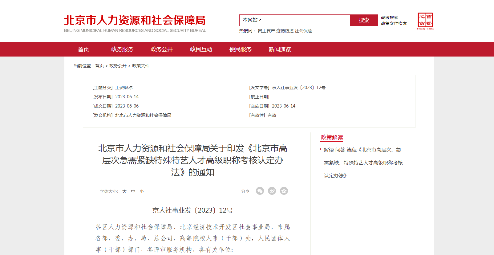 6月14日,北京市人力資源和社會(huì)保障局發(fā)布《關(guān)于進(jìn)一步加強(qiáng)和改進(jìn)職稱工作的通知》及相關(guān)配套措施,明確對(duì)高層次、急需緊缺人才等不拘一格“評(píng)”人才。