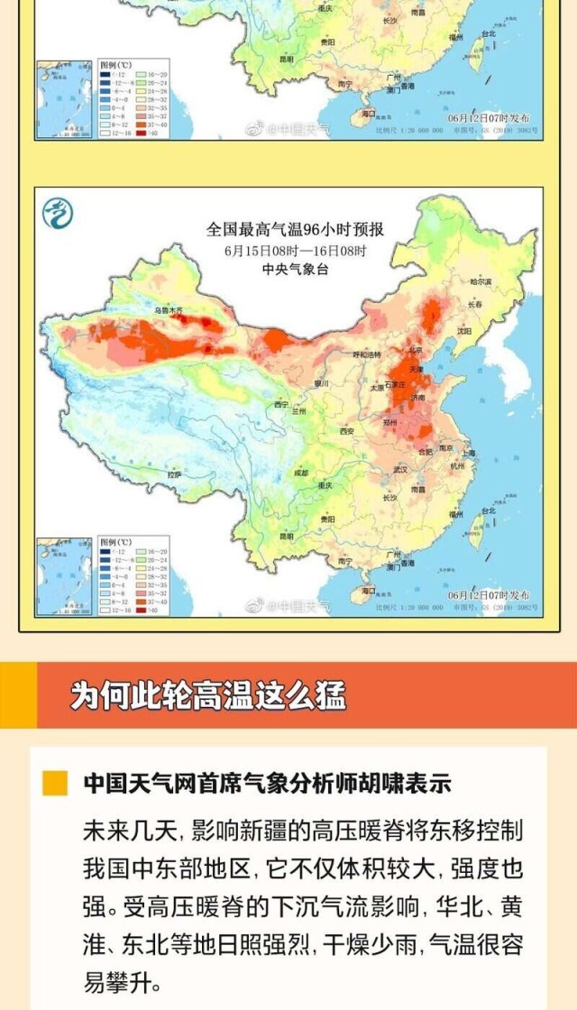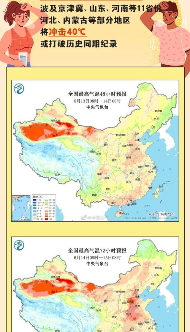 6月14日至下周初,華北、黃淮等多地將迎今年來(lái)范圍最廣、強(qiáng)度最強(qiáng)的高溫天氣過(guò)程,波及京津冀、山東、河南等11省份,河北、內(nèi)蒙古等部分地區(qū)將沖擊40℃,或打破歷史同期紀(jì)錄。全國(guó)總工會(huì)也發(fā)出提示,各級(jí)工會(huì)要督促用人單位提供必要的防護(hù)用品和高溫作業(yè)休息場(chǎng)所。為何這輪高溫這么猛?有哪些防范高溫天氣的建議?一起來(lái)看。