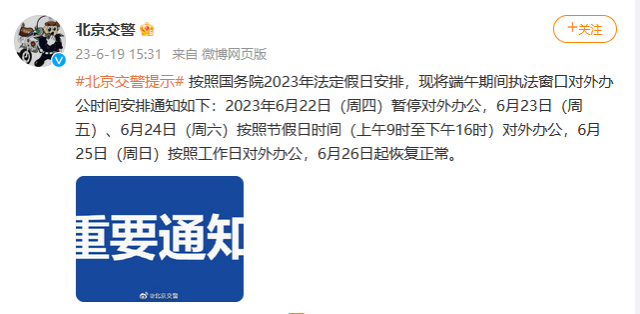 央視網(wǎng)消息:據(jù)北京交警微博消息,按照國(guó)務(wù)院2023年法定假日安排,現(xiàn)將端午期間執(zhí)法窗口對(duì)外辦公時(shí)間安排通知如下:2023年6月22日(周四)暫停對(duì)外辦公,6月23日(周五)、6月24日(周六)按照節(jié)假日時(shí)間(上午9時(shí)至下午16時(shí))對(duì)外辦公,6月25日(周日)按照工作日對(duì)外辦公,6月26日起恢復(fù)正常。