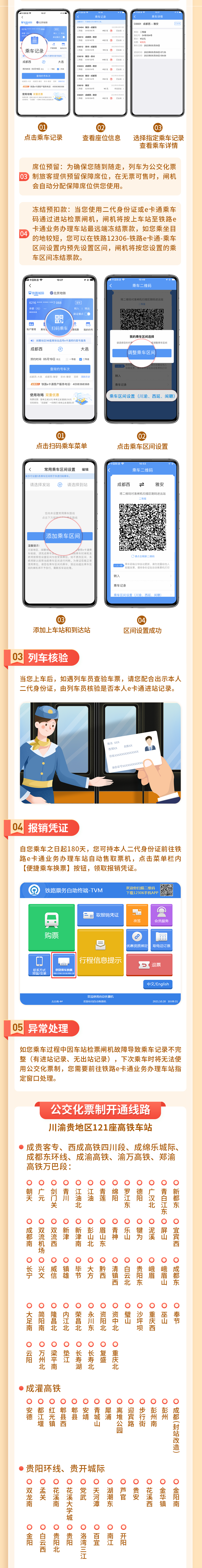 為進一步提升通勤旅客出行體驗,中國鐵路成都局集團有限公司管內(nèi)的川渝貴地區(qū)121座高鐵車站啟用公交化票制。已開通鐵路e卡通的旅客在鐵路12306客戶端-鐵路e卡通主頁,啟用刷證模式,即可使用二代身份證或e卡通乘車碼,實現(xiàn)無需購票,刷證或掃碼即走。