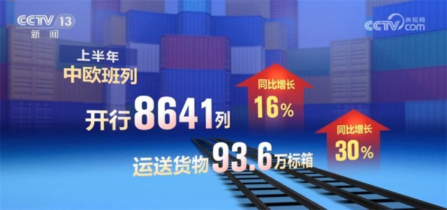 上半年,中歐班列開行8641列、運(yùn)送貨物93.6萬標(biāo)箱,同比分別增長16%、30%。