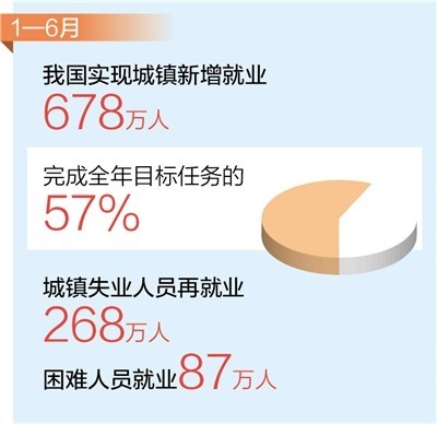 前6月,我國實現(xiàn)城鎮(zhèn)新增就業(yè)678萬人,完成全年目標(biāo)任務(wù)的57% 就業(yè)形勢保持總體穩(wěn)定