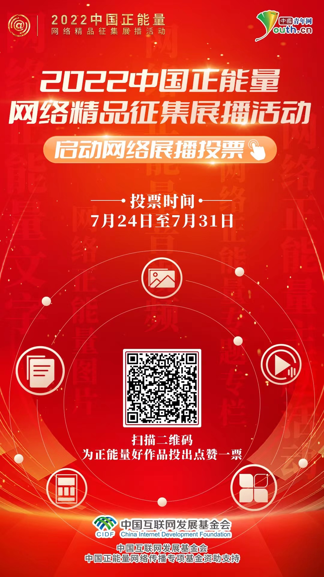 團(tuán)結(jié)奮進(jìn)新征程,同心奮斗創(chuàng)偉業(yè)。由中央網(wǎng)信辦主辦的2022中國正能量網(wǎng)絡(luò)精品征集展播活動已正式啟動網(wǎng)絡(luò)展播投票。網(wǎng)絡(luò)正能量文字、網(wǎng)絡(luò)正能量圖片、網(wǎng)絡(luò)正能量音視頻、網(wǎng)絡(luò)正能量專題專欄、網(wǎng)絡(luò)正能量主題活動,約1100件正能量好作品匯聚網(wǎng)絡(luò)空間,歡迎廣大網(wǎng)友掃描二維碼關(guān)注作品、參與投票,讓“大流量”澎湃正能量。(劉尚君 潘曉文 朱鈞有)