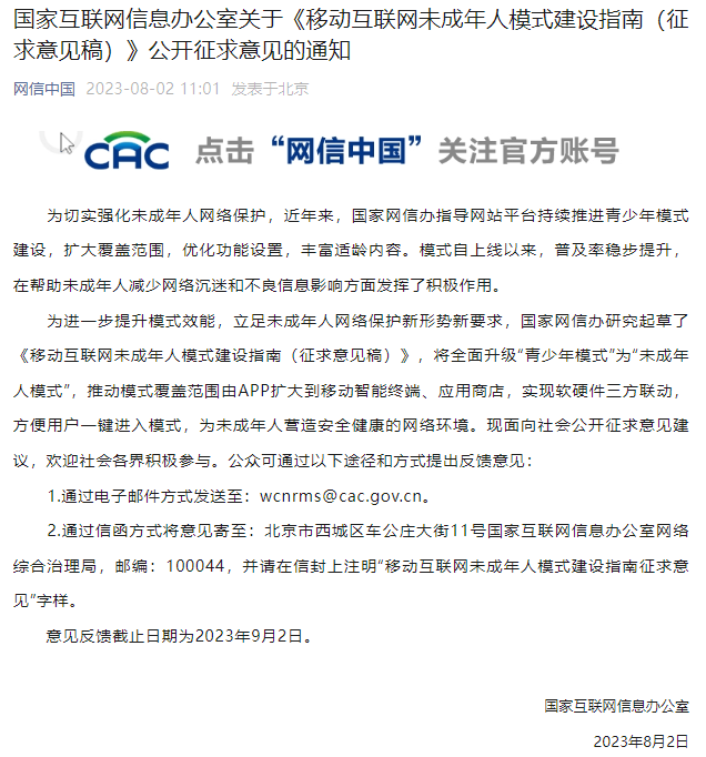 國家互聯(lián)網(wǎng)信息辦公室關(guān)于《移動互聯(lián)網(wǎng)未成年人模式建設(shè)指南(征求意見稿)》公開征求意見的通知