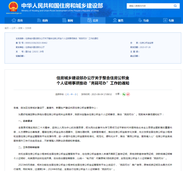 通知提到,2023年8月底前,相關(guān)功能在全國住房公積金小程序和全國住房公積金監(jiān)管服務(wù)平臺上線運(yùn)行,“亮碼可辦”推廣使用,原有紙質(zhì)證明及出具方式并行使用、同時有效,過渡期1年;2024年8月起,全面實(shí)行住房公積金個人證明事項“亮碼可辦”。通知還提出精簡整合證明材料、調(diào)整證明開具方式、暢通窗口查驗功能、優(yōu)化業(yè)務(wù)辦理流程、健全協(xié)同工作機(jī)制五項工作任務(wù)。