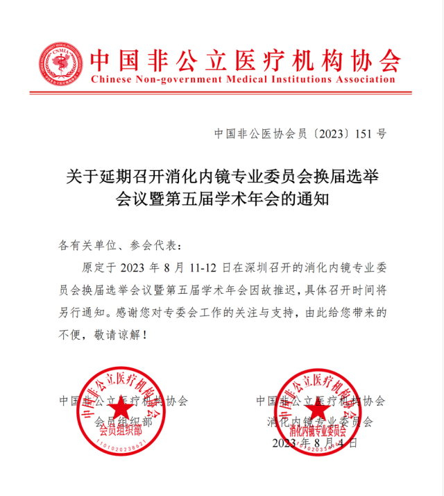 消化內(nèi)鏡專業(yè)委員會換屆選舉會議暨第五屆學(xué)術(shù)年會延期通知。圖片來源:中國非公立醫(yī)療機(jī)構(gòu)協(xié)會