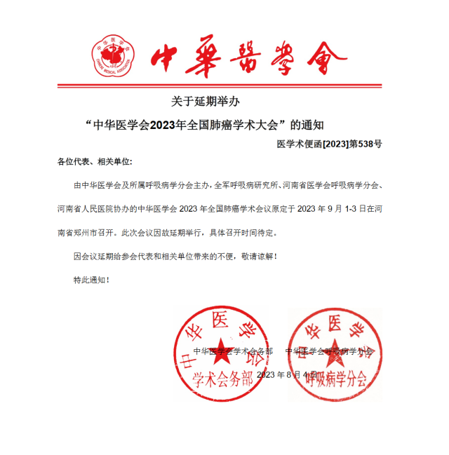 8月4日,中華醫(yī)學(xué)會2023年全國肺癌學(xué)術(shù)會議原定于2023年9月1-3日在河南省鄭州市召開,因故延期舉行,具體召開時間待定。