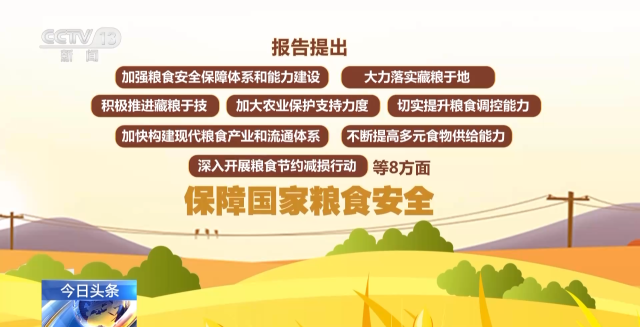 報告提出,將從加強(qiáng)糧食安全保障體系和能力建設(shè)、大力落實(shí)藏糧于地、積極推進(jìn)藏糧于技、加大農(nóng)業(yè)保護(hù)支持力度、切實(shí)提升糧食調(diào)控能力、加快構(gòu)建現(xiàn)代糧食產(chǎn)業(yè)和流通體系、不斷提高多元食物供給能力、深入開展糧食節(jié)約減損行動等8方面,保障國家糧食安全。