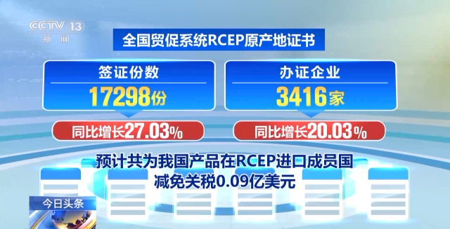 中國貿(mào)促會8月30日介紹:今年7月份,全國貿(mào)促系統(tǒng)累計(jì)簽發(fā)原產(chǎn)地證書等各類證書54.62萬份,較上年同比增長12.82%。全國貿(mào)促系統(tǒng)RCEP原產(chǎn)地證書簽證份數(shù)為17298份,同比增長27.03%;辦證企業(yè)3416家,同比增長20.03%,預(yù)計(jì)共為我國產(chǎn)品在RCEP進(jìn)口成員國減免關(guān)稅0.09億美元。