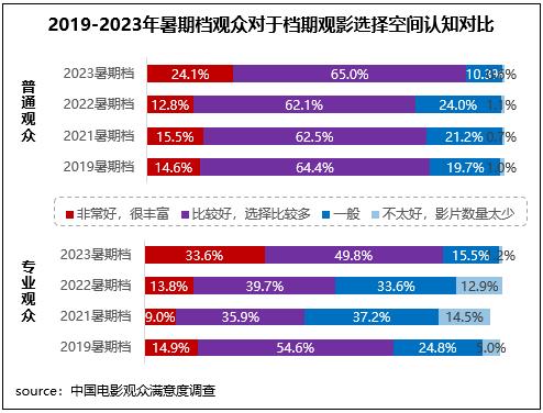 2023年7-8月新上映影片共80部,為近四年來同期最高值,滿意度調(diào)查的13部影片涵蓋劇情、動畫、奇幻、懸疑、愛情、喜劇、動作等多元類型,給觀眾帶來多樣化的觀影選擇。調(diào)研數(shù)據(jù)顯示,不同觀眾對于檔期觀影選擇空間均給予了好評,普通觀眾、專業(yè)觀眾認(rèn)為檔期觀影選擇“非常好,很豐富”和“比較好,選擇比較多”的占比合計分別達(dá)89.2%、83.4%,均為近五年同期最高。