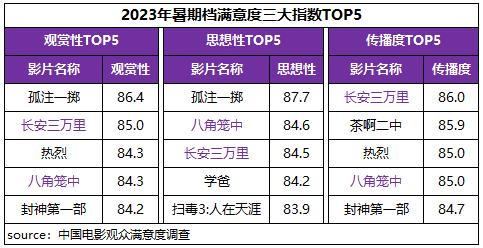 中國電影觀眾滿意度調(diào)查 2023年暑期檔調(diào)查結(jié)果顯示,暑期檔電影觀眾滿意度得分84.5分,較“五一”檔增長1.2分。檔期豐富多元的影片內(nèi)容得到了觀眾的高滿意度評價,調(diào)查的13部影片悉數(shù)進(jìn)入“滿意”區(qū)間(≥80分),有6部影片滿意度超84分,數(shù)量及占比居歷年同期之最。其中《孤注一擲》《長安三萬里》分別以86.4分、85.1分為檔期滿意度單片冠亞軍,《八角籠中》《茶啊二中》《熱烈》和《封神第一部》四部影片滿意度均超84分。2023年暑期檔高滿意度佳作迭出,市場驚喜不斷,觀影氛圍持續(xù)火熱。
