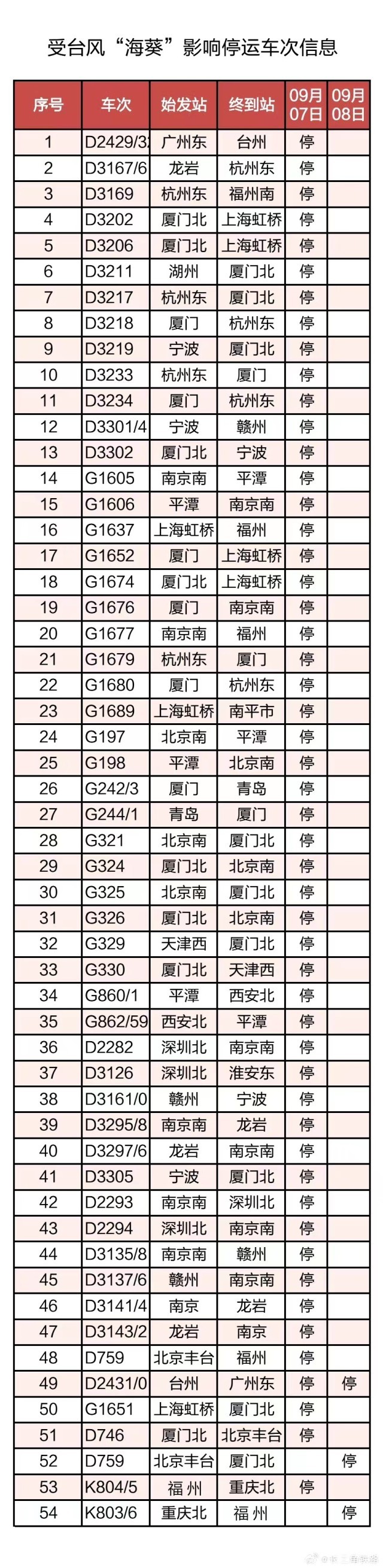 截至9月6日22時,計劃停運9月7日至9月8日間共54趟旅客列車:其中停運動車組列車52趟,停運普速列車2趟。