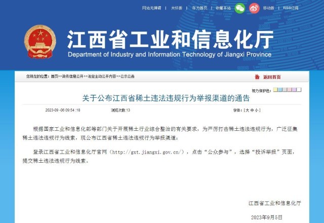 中新網(wǎng)9月6日電 據(jù)江西省工業(yè)和信息化廳官網(wǎng)6日消息,根據(jù)國家工業(yè)和信息化部等部門關(guān)于開展稀土行業(yè)綜合整治的有關(guān)要求,為嚴(yán)厲打擊稀土違法違規(guī)行為,廣泛征集稀土違法違規(guī)行為線索,現(xiàn)公布江西省稀土違法違規(guī)行為舉報渠道:登錄江西省工業(yè)和信息化廳官網(wǎng),點(diǎn)擊“公眾參與”,選擇“投訴舉報”頁面,提交稀土違法違規(guī)行為線索。