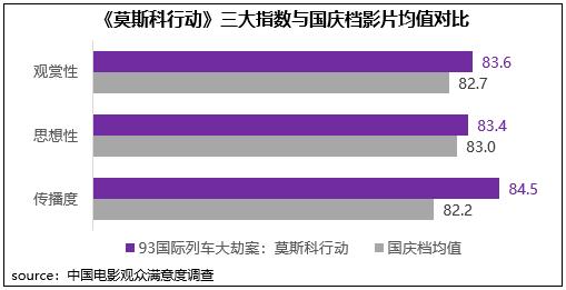 《莫斯科行動(dòng)》根據(jù)上世紀(jì)90年代跨境追捕搶劫案犯案件改編,在真實(shí)社會(huì)事件基礎(chǔ)之上有機(jī)融入商業(yè)化要素,三大指數(shù)得分均超83分;其中傳播度得分84.5分,居檔期首位,影片延續(xù)邱禮濤導(dǎo)演的動(dòng)作類(lèi)型片風(fēng)格,#莫斯科行動(dòng)是純血類(lèi)型片#詞條登上微博熱搜,影片突出的硬核熱血?dú)赓|(zhì)引熱議。