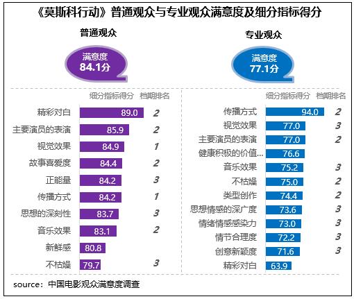 在不同觀眾評(píng)價(jià)上,《莫斯科行動(dòng)》相對(duì)更受普通觀眾青睞,普通觀眾滿意度得分84.1分,居檔期第二位,與《堅(jiān)如磐石》相差0.1分;專(zhuān)業(yè)觀眾滿意度得分77.1分,居檔期第三位。在細(xì)分指標(biāo)中,影片視覺(jué)效果和主要演員的表演均得到了不同觀眾的高度認(rèn)可,得分為各自評(píng)價(jià)指標(biāo)體系的前三名,也都居檔期五部影片的前三位。