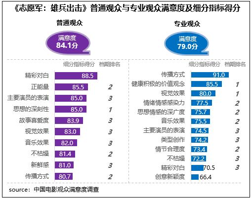 在不同觀眾評(píng)價(jià)上,《志愿軍:雄兵出擊》相對(duì)更受專(zhuān)業(yè)觀眾青睞,專(zhuān)業(yè)觀眾滿意度得分79.0分,居檔期第二位;在細(xì)分指標(biāo)中,健康積極的價(jià)值觀念、視覺(jué)效果兩項(xiàng)指標(biāo)得分居檔期首位,同時(shí)分別居2023年調(diào)查50部影片的第4位和第8位。影片普通觀眾滿意度得分84.1分,居檔期第三位,僅比《堅(jiān)如磐石》和《93國(guó)際列車(chē)大劫案:莫斯科行動(dòng)》分別低0.1分、0.02分,細(xì)分指標(biāo)中思想深刻性得分居檔期首位。