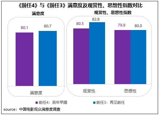由田羽生執(zhí)導(dǎo),韓庚、鄭愷主演的都市愛(ài)情輕喜劇電影《前任4:英年早婚》觀眾滿意度80.1分,與六年前上映的系列上一部《前任3:再見(jiàn)前任》相差不大,略下降0.6分;其中二者思想性得分幾近持平,觀賞性下降了2.3分。