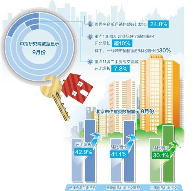 隨著需求釋放動(dòng)能減弱,9月后兩周成交量明顯下降。北京市住建委數(shù)據(jù)顯示,9月份,北京新建商品住宅簽約5891套,成交面積67.96萬平方米,環(huán)比分別增長42.9%和41.1%;二手商品住宅成交14262套,環(huán)比增長30.1%。