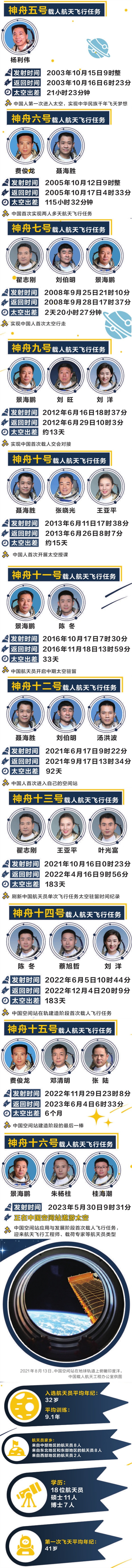 中國的航天員隊伍同樣經歷了這樣的選拔和訓練過程。2003年,中國航天史上第一位叩響宇宙之門的航天員楊利偉進入太空,揭開了中國載人航天的新篇章。那之后,費俊龍、聶海勝、翟志剛、劉伯明、景海鵬、劉洋、劉旺、王亞平、張曉光、陳冬、湯洪波、葉光富、蔡旭哲、鄧清明、張陸、朱楊柱、桂海潮……截至目前,一共18位中國航天員成功逐夢九天,太空一次又一次迎來中國人的身影。
