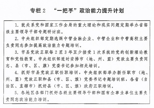 ?。ǘ┩怀觥瓣P(guān)鍵少數(shù)”政治訓(xùn)練。堅(jiān)持把政治訓(xùn)練貫穿干部成長全周期,使干部的政治素養(yǎng)、政治能力與擔(dān)負(fù)的領(lǐng)導(dǎo)職責(zé)相匹配。強(qiáng)化“一把手”政治培訓(xùn),有計(jì)劃地選調(diào)地方、部門、國有企事業(yè)單位主要負(fù)責(zé)同志到黨校(行政學(xué)院)、干部學(xué)院參加專題培訓(xùn)。實(shí)施“一把手”政治能力提升計(jì)劃(專欄2)。省(自治區(qū)、直轄市)、市(地、州、盟)、縣(市、區(qū)、旗)黨政領(lǐng)導(dǎo)班子成員每2至3年到黨校(行政學(xué)院)、干部學(xué)院至少接受1次系統(tǒng)的黨的創(chuàng)新理論教育和黨性教育,5年內(nèi)累計(jì)不少于2個月。圍繞提高政治能力和領(lǐng)導(dǎo)能力,加強(qiáng)機(jī)關(guān)司局長、處長任職培訓(xùn)。重視對女干部、少數(shù)民族干部、黨外干部等的政治培訓(xùn)。加強(qiáng)對高層次人才的政治引領(lǐng),中央組織部會同有關(guān)單位每年組織一定數(shù)量人才開展國情研修。