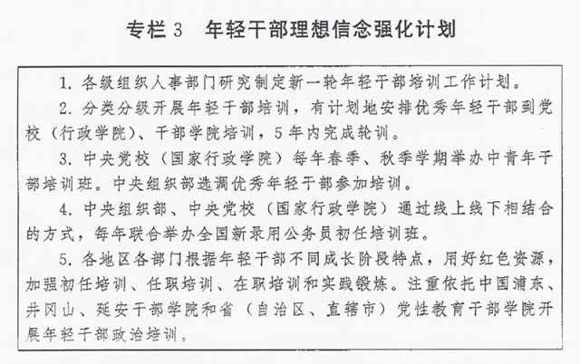?。ㄈ┘訌?qiáng)年輕干部政治訓(xùn)練。強(qiáng)化習(xí)近平新時(shí)代中國特色社會主義思想學(xué)習(xí)教育,突出政治忠誠教育、理想信念教育、紀(jì)律規(guī)矩教育,加強(qiáng)優(yōu)良傳統(tǒng)作風(fēng)和責(zé)任感使命感教育,強(qiáng)化斗爭意識,綜合運(yùn)用理論講授、政策解讀、案例教學(xué)、現(xiàn)場體驗(yàn)等方式開展系統(tǒng)培訓(xùn)。黨委(黨組)負(fù)責(zé)同志要講好“開班第一課”。安排思想政治素質(zhì)過硬、理論水平較高、實(shí)踐經(jīng)驗(yàn)豐富的領(lǐng)導(dǎo)干部上講臺授課。探索推行“政治輔導(dǎo)員”、“導(dǎo)師幫帶”制度。通過開展黨性分析、實(shí)踐鍛煉、過“政治生日”、重溫入黨誓詞等方式,錘煉黨性修養(yǎng)、提高政治覺悟。實(shí)施年輕干部理想信念強(qiáng)化計(jì)劃(專欄3)。