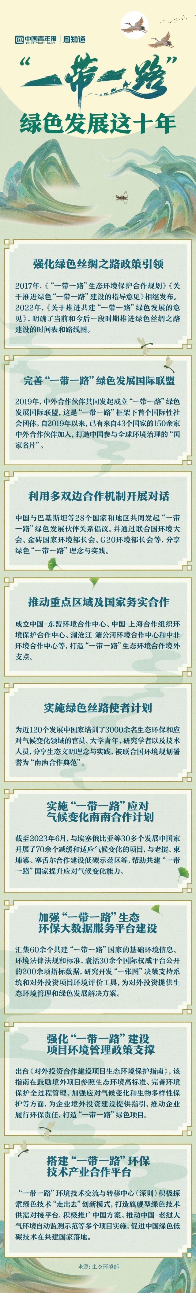 綠色已成為共建“一帶一路”鮮明底色。十年來,綠色絲綢之路建設(shè)為全球環(huán)境與氣候治理不斷貢獻力量。中國實施的綠色絲路使者計劃為近120個發(fā)展中國家培訓(xùn)了3000余名生態(tài)環(huán)保和應(yīng)對氣候變化領(lǐng)域的大學(xué)青年、技術(shù)人員等,許多年輕人成為綠色絲路使者,為共建“一帶一路”國家落實聯(lián)合國2030年可持續(xù)發(fā)展議程提供方案,接力下一個十年。