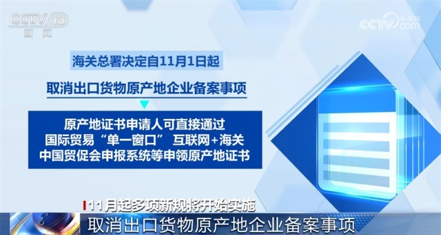 海關(guān)總署決定自11月1日起,取消出口貨物原產(chǎn)地企業(yè)備案事項(xiàng),原產(chǎn)地證書(shū)申請(qǐng)人可直接通過(guò)國(guó)際貿(mào)易“單一窗口”“互聯(lián)網(wǎng)+海關(guān)”、中國(guó)貿(mào)促會(huì)申報(bào)系統(tǒng)等申領(lǐng)原產(chǎn)地證書(shū),進(jìn)一步優(yōu)化跨境貿(mào)易營(yíng)商環(huán)境,提升貿(mào)易便利。