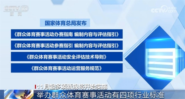 國(guó)家體育總局發(fā)布的《群眾體育賽事活動(dòng)辦賽指南 編制內(nèi)容與評(píng)估指引》《群眾體育賽事活動(dòng)參賽指引 編制內(nèi)容與評(píng)估指引》《群眾體育賽事活動(dòng)安全評(píng)估技術(shù)導(dǎo)則》《群眾體育賽事活動(dòng)運(yùn)營(yíng)服務(wù)規(guī)范》四項(xiàng)體育行業(yè)標(biāo)準(zhǔn)自11月1日起實(shí)施。這些標(biāo)準(zhǔn)明確了群眾體育賽事活動(dòng)安全評(píng)估的流程、策劃、實(shí)施和總結(jié),運(yùn)營(yíng)服務(wù)的基本要求、服務(wù)要求、管理要求等內(nèi)容,適用于各級(jí)各類(lèi)群眾體育賽事活動(dòng)的舉辦。