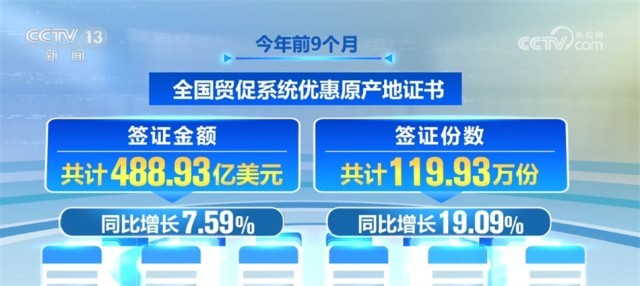 數(shù)據(jù)顯示,今年前9個(gè)月,全國貿(mào)促系統(tǒng)累計(jì)簽發(fā)原產(chǎn)地證書、ATA單證冊(cè)、商事證明書等各類證書455.06萬份,較上年同比增長(zhǎng)13.39%。